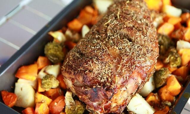 4.烤羊腿的時候刷蜂蜜水,可以使表面汁水稠厚,吃起來甜甜酥酥的,而且滲下去的蜂蜜水滴在蔬菜上,也是絕配.