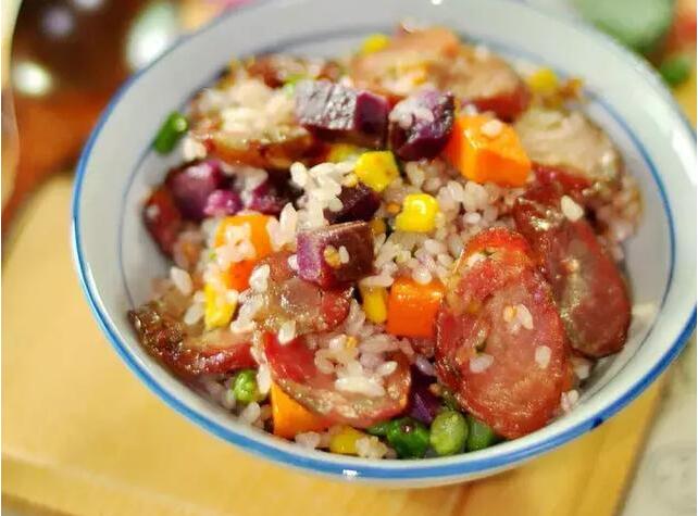紫薯和湘西【王家五】熏制臘腸、大米一起燜制,最樸實無華的組合,簡單的做法,配上繽紛的色彩,竟然讓很普通的食材如此的華麗。蔬菜、紫薯混合著臘腸的油香,大米的清香,燜出的飯香味四溢。