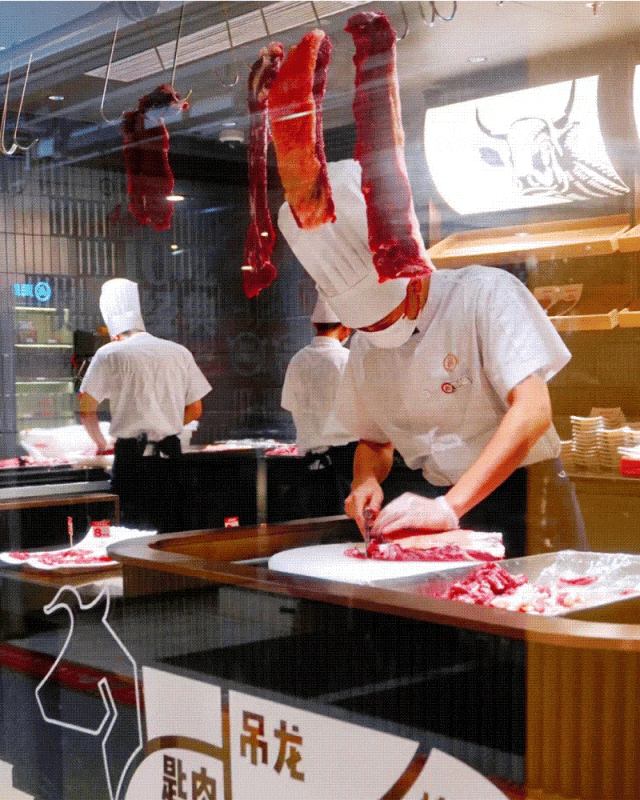其次,在門店開設(shè)了明檔現(xiàn)切的牛肉檔口,新鮮的牛肉懸掛,幾位師傅在里面切肉裝盤的場(chǎng)景一目了然。