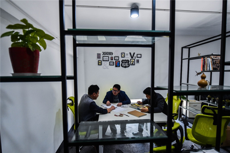 “吳興夢(mèng)工場(chǎng)”內(nèi)的企業(yè)員工在討論工作(4月13日攝)。浙江省湖州市吳興區(qū)環(huán)渚街道依托湖州市本地高校人才優(yōu)勢(shì),加快舊廠區(qū)改造步伐,將一家絲織企業(yè)的舊廠房創(chuàng)建為湖州市首家主題特色大學(xué)生創(chuàng)意創(chuàng)業(yè)園區(qū)——“吳興夢(mèng)工場(chǎng)”。通過(guò)設(shè)立創(chuàng)業(yè)獎(jiǎng)勵(lì)金和實(shí)行租金優(yōu)惠等多項(xiàng)措施,推動(dòng)入駐小微企業(yè)與高等院校進(jìn)行合作,促進(jìn)高校畢業(yè)生到夢(mèng)工場(chǎng)創(chuàng)業(yè)與就業(yè)。