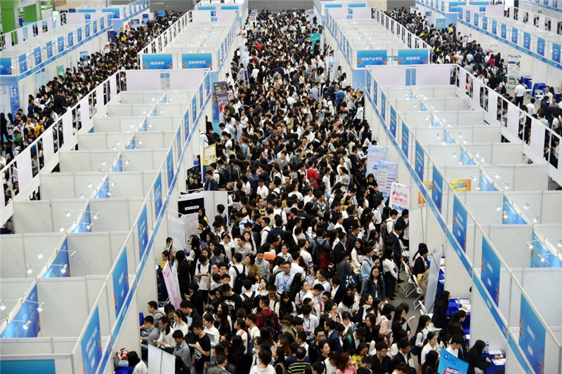 在深圳會(huì)展中心舉行的第三屆全國(guó)高校畢業(yè)生春季雙選會(huì)現(xiàn)場(chǎng)人頭攢動(dòng)(4月15日攝)。