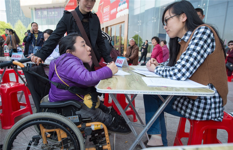 在安徽省合肥市蜀山區(qū)春季殘疾人專(zhuān)場(chǎng)招聘會(huì)現(xiàn)場(chǎng),一名求職者在向用人單位工作人員咨詢(xún)(4月14日攝)。