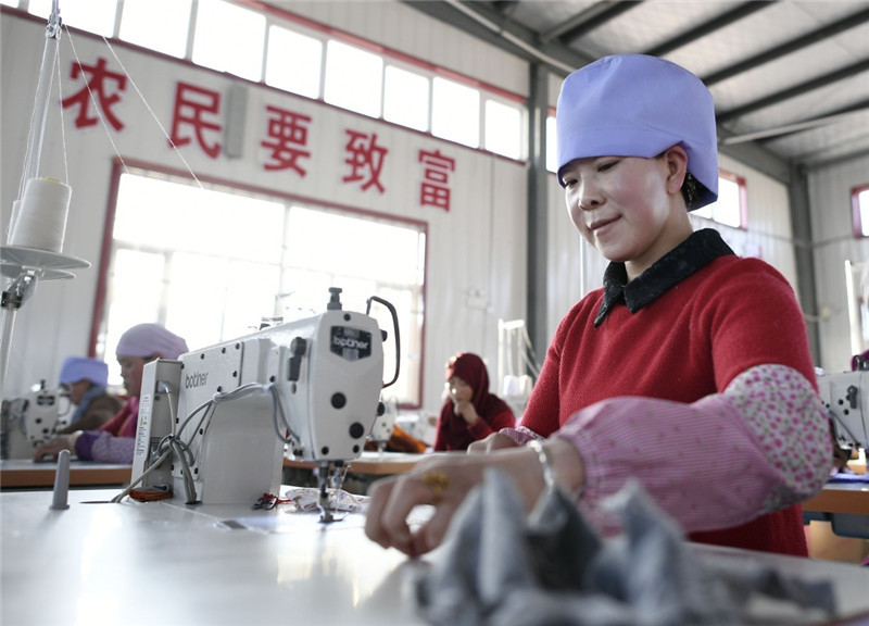寧夏吳忠市同心縣河西鎮(zhèn)旱天嶺村村民在村里的“扶貧車(chē)間”參加服裝加工技能培訓(xùn)(12月21日攝)。這座新落成的“扶貧車(chē)間”可解決本村上百名建檔立卡貧困婦女的就業(yè)問(wèn)題。