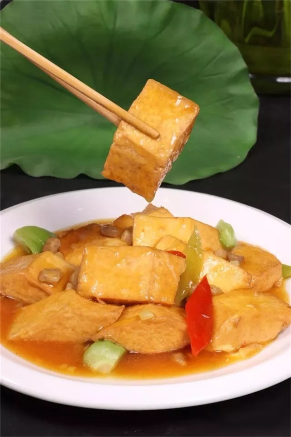 鍋入豬油40克燒熱,下五花肉丁50克炒至發(fā)白,投入蔥花、姜末各5克炒香,烹第一福味汁100克燒沸,倒入炸好的豆腐350克、青紅椒片各15克輕輕翻動燒透,勾薄芡即可出鍋。