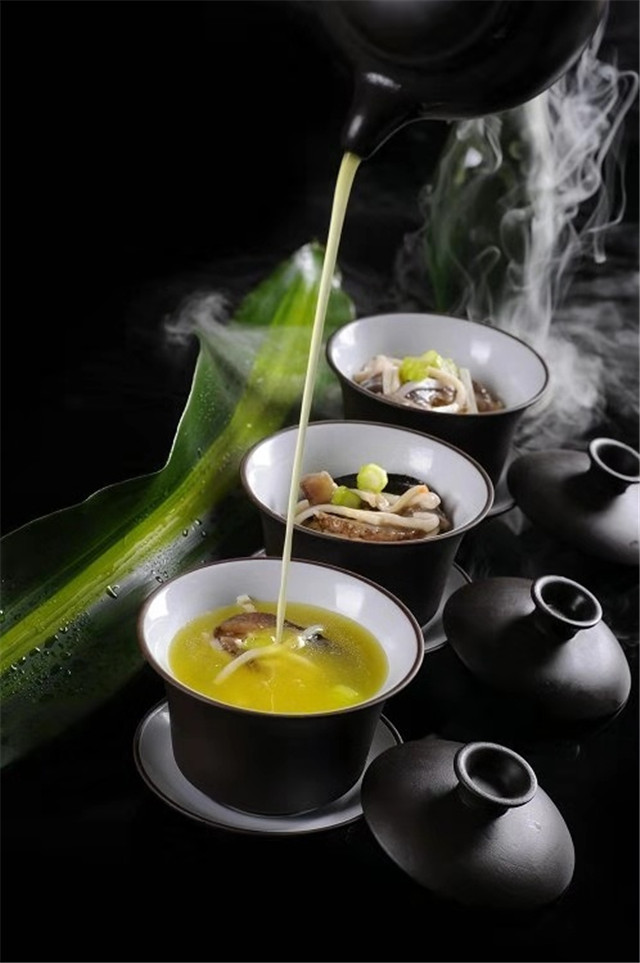 4、雞湯盛入功夫茶茶壺內(nèi),茶碗中放入炸好的泰國(guó)香米墊底,將遼參、鮮松茸、菜心、新鮮茉莉花一次堆疊在上面,即可一起出菜。