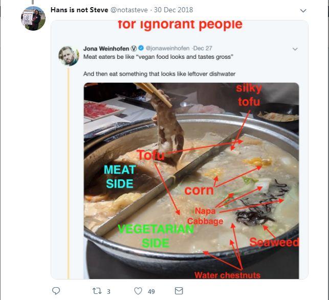 一位日本網(wǎng)友對Jona Weinhofen如此形容火鍋表示很遺憾。他給Weinhofen科普了下火鍋的博大精深,告訴他火鍋完全可以做成素食的,是素食主義者不錯的選擇,也很健康。他希望Weinhofen是無意識地選了一張不太能引起食欲的火鍋圖片,而不是有意為之的精挑細(xì)選,故意侮辱中國料理,讓自己陷入爭議。