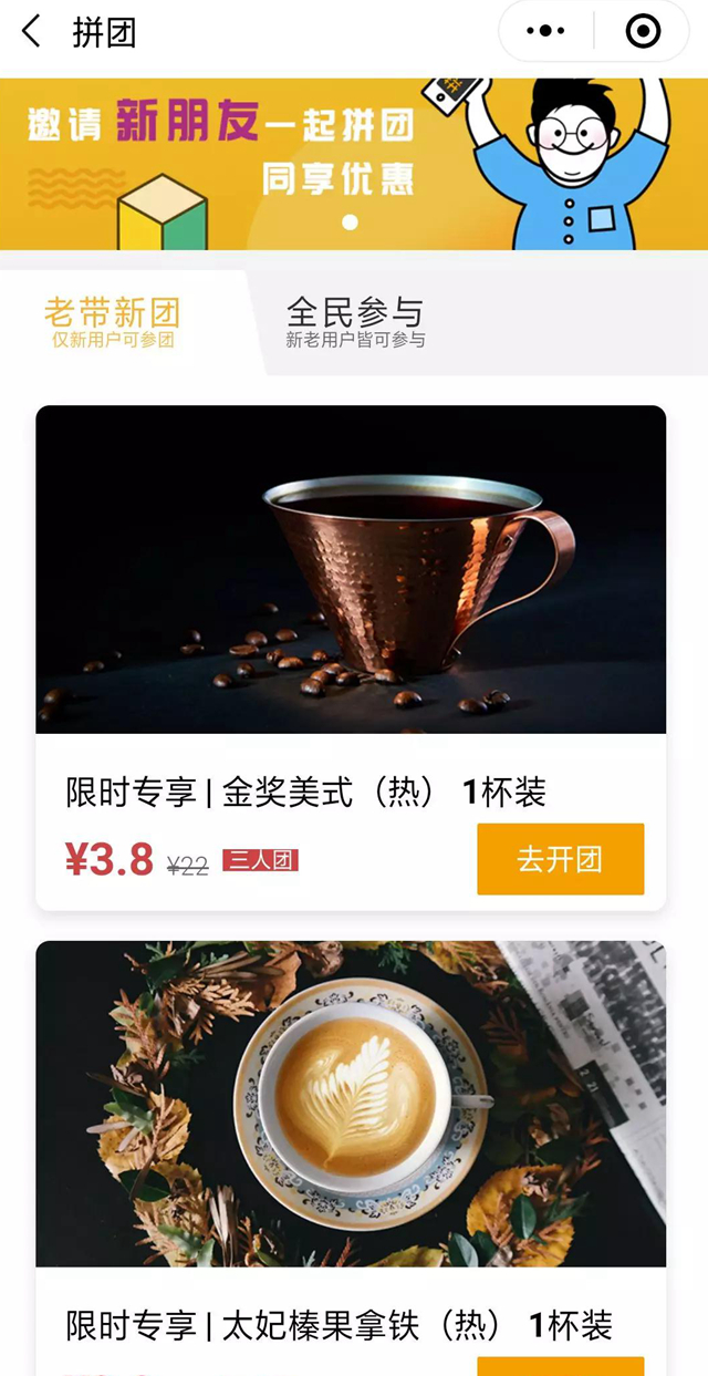 使用拼多多的成名招數(shù),采用“老帶新”、“全民參與”這樣優(yōu)惠拼團分享的活動,逐步積累大量用戶。