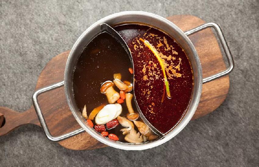 上周和朋友來這家店約飯,進店發(fā)現(xiàn)墻上的鍋底廣告頁換新了,除了傳統(tǒng)口味,又上了藤椒、金湯和酸菜3種鍋底,我和朋友就果斷點了藤椒和酸菜的,不到1分鐘,老板就把鍋底端了上來。
