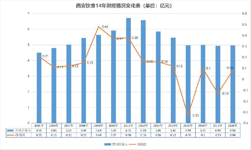 1956年成立的西安飲食也是國有企業(yè),它經(jīng)過不斷地整體改組,更多地面向市場化,在1997年就已經(jīng)成功登陸深交所。西安飲食近14年來的業(yè)績發(fā)展情況,其利潤增長堪比心電圖。