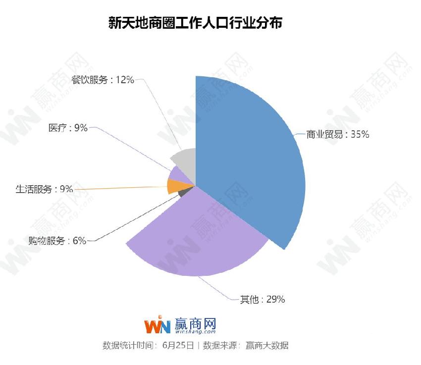 在新天地商圈內(nèi),消費(fèi)者工作人口相比居民人口的比例更高,其中85%的工作人口為19-44歲的中青年人,34.88%的工作人口從事商業(yè)貿(mào)易行業(yè)。這樣的數(shù)據(jù)說明新天地商圈的人群較年輕,商務(wù)人群數(shù)量大,一些輕奢餐飲尤其是茶飲咖啡甜品等“網(wǎng)紅”會更受歡迎。