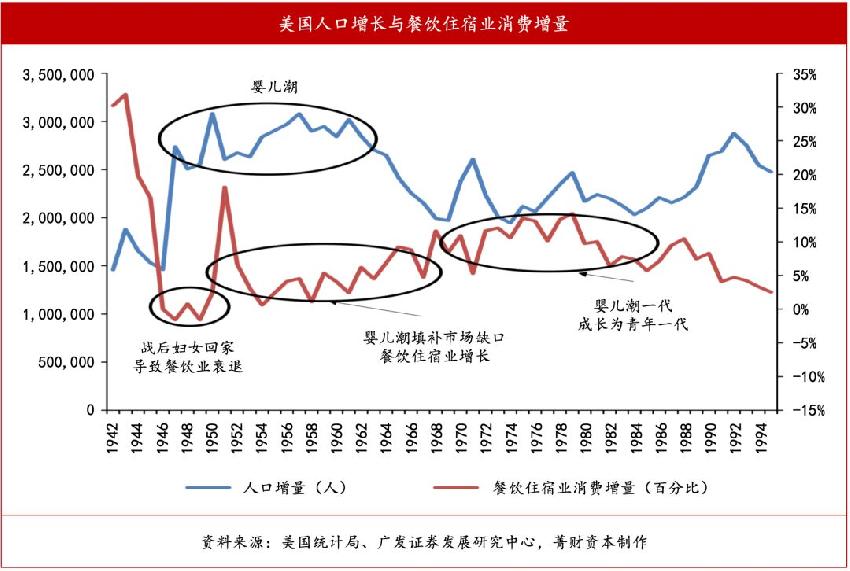 美國早期的餐飲業(yè)經(jīng)驗(yàn)表明,人口增長是餐飲業(yè)發(fā)展的必要條件。“嬰兒潮一代”的出現(xiàn)迅速填補(bǔ)了美國餐飲業(yè)的市場缺口,且隨著時(shí)間的推進(jìn),巨量增長的年輕人口不僅拉動(dòng)了整個(gè)餐飲市場的發(fā)展,還推動(dòng)了很多快餐企業(yè)的變革創(chuàng)新。