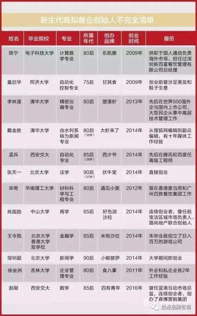 如從BAT出來的西少爺創(chuàng)始人孟兵、北大法學(xué)碩士張?zhí)煲坏?ldquo;伏牛堂米粉”、中科院電子所助理研究員小蹄大作的創(chuàng)始人李功福等。