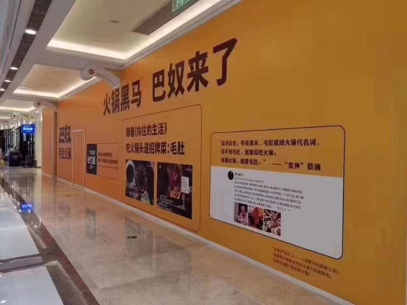 在墻壁燈箱上,使用了大量關(guān)于毛肚的素材,看得出意在強化顧客對毛肚的認知。