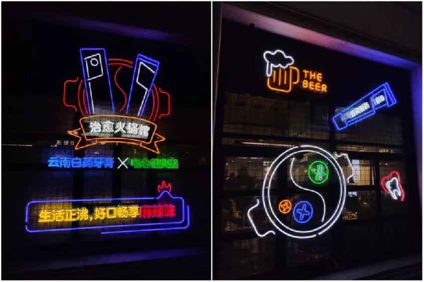 【治愈火鍋館】在店面裝飾、菜單名稱等每一處細(xì)節(jié)都展示了滿滿的治愈感,整體色調(diào)設(shè)計(jì)結(jié)合了電臺(tái)巷的“復(fù)古綠”與云南白藥牙膏的“治愈藍(lán)”,店內(nèi)墻體、窗上裝飾著牙膏、火鍋圖形的復(fù)古霓虹燈,吸引了眾多消費(fèi)者的目光。