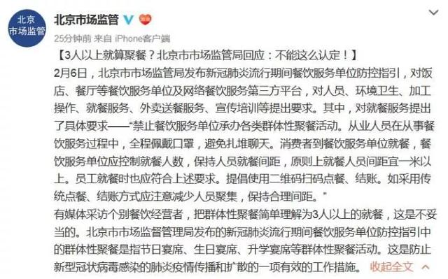 2月6日,北京市市場監(jiān)管局發(fā)布新冠肺炎流行期間餐飲服務(wù)單位防控指引,對飯店、餐廳等餐飲服務(wù)單位及網(wǎng)絡(luò)餐飲服務(wù)第三方平臺,對人員、環(huán)境衛(wèi)生、加工操作、就餐服務(wù)、外賣送餐服務(wù)、宣傳培訓等提出要求。
