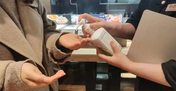 “您好,用免洗洗手液先洗個(gè)手吧。”