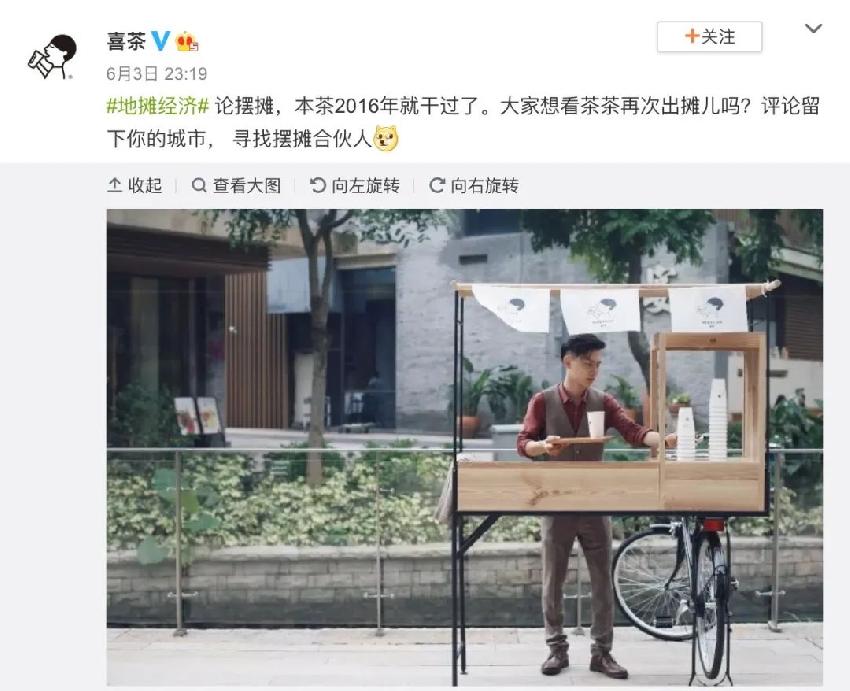 喜茶創(chuàng)始人聶云辰,昨天在朋友圈轉(zhuǎn)發(fā)了喜茶官方微博的圖片,“論擺攤,本茶2016年就干過了”。