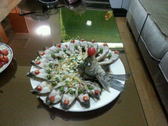 把青紅椒擺上。如圖,這個(gè)不用多解釋了吧。孔雀開屏魚.的做法
