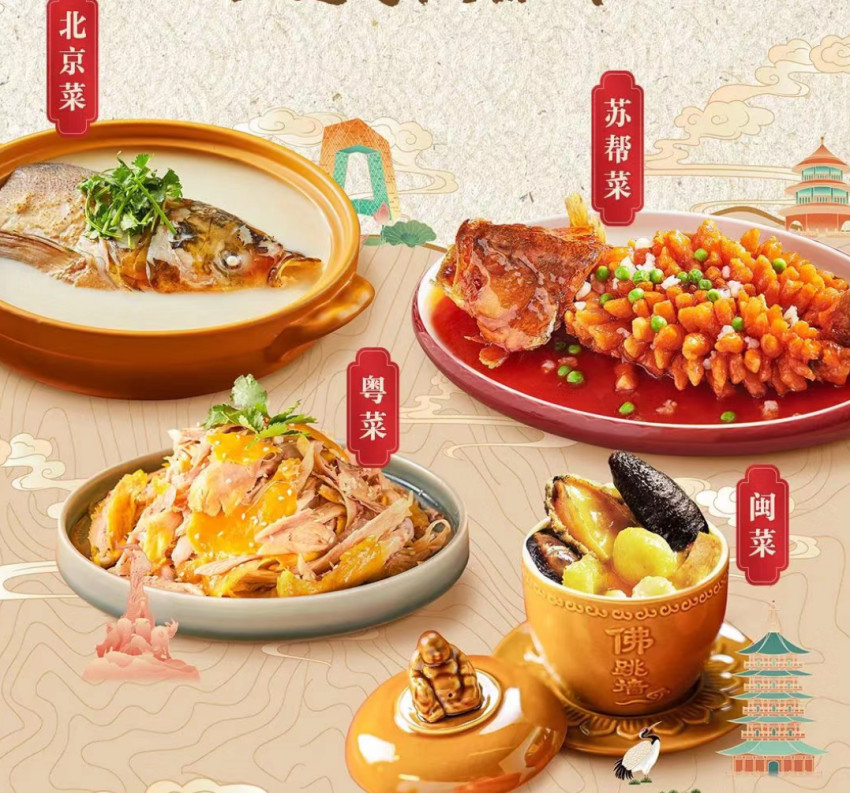 沃爾瑪認(rèn)為,在家宴、聚餐的消費(fèi)場景下,顧客傾向于追求“品質(zhì)”、“正宗”和“價(jià)值感”,而不僅僅是“快捷”。因此,沃爾瑪精準(zhǔn)定位選品策略,推出70多道“南北名店招牌菜”,囊括中外地方特色的“八大菜系”,比如四川眉州東坡的東坡扣肉、北京旺順閣的魚頭湯、上海老飯店的富貴蹄、福州聚春園的佛跳墻、廣州陶陶居的鹽焗雞等,從開胃冷菜、湯、熱菜、主食到甜品全面覆蓋。