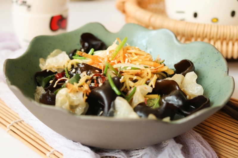 食材:黑木耳10克 銀耳1朵 姜10克 蒜3粒 香菜1棵 花椒5粒 生抽15毫升 香醋10毫升 鹽1克 花生油15毫升 白糖5克
