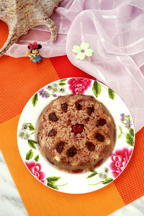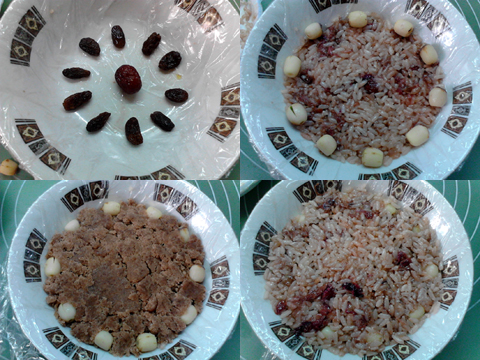 將葡萄干在碗底擺上一圈,中央放一顆紅棗。鋪上2/5的糯米飯,再將蓮子沿圓周擺上一圈。鋪上紅豆沙,再用1/5糯米飯蓋住紅豆沙。