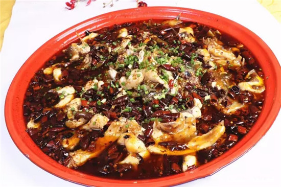 其中最受歡迎、傳播速度最快的便是這道招牌魚肴:將魚肉碼味后用辣椒、花椒、豆瓣醬等輔料炒香,添魚湯煨入味,淋紅苕粉勾芡,撒上干辣椒碎,淋熱油激香。此菜兼具麻辣鮮香燙嫩等特點(diǎn),是許多客人來(lái)店必點(diǎn)的菜肴,每天能賣60多份。