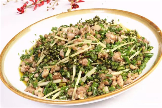 3、鍋入菜籽油燒至五成熱,下青小米椒圈、蒜末、老姜絲、鮮花椒翻勻炒香,倒入滑好的兔肉,調(diào)入雞精、白糖、鹽少許,淋入熟菜籽油顛鍋翻勻,起鍋將兔肉丁倒在盤里即可走菜。