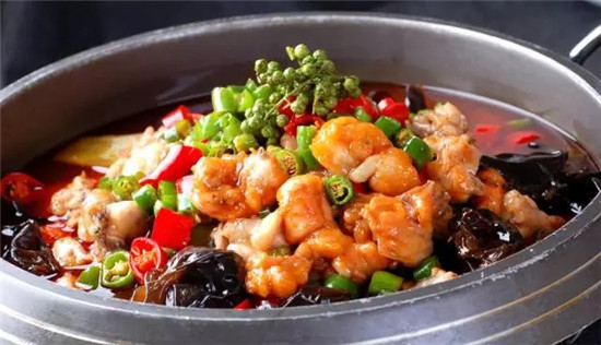 3、鍋入提前熬好的料湯燒開(kāi),下入牛蛙,加鹽、味精、雞粉調(diào)味,再次燒沸后改小火煮2-3分鐘,勾米湯芡,起鍋倒入墊有輔料的盤中,表面撒美人椒段、花椒。
