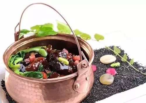 2、臨出菜時,取壓好的牛肉入鍋,與汆熟的青豆同燒至汁稠,撒入紅椒丁,起鍋裝在小銅鍋里,點綴汆熟的菜心便好。