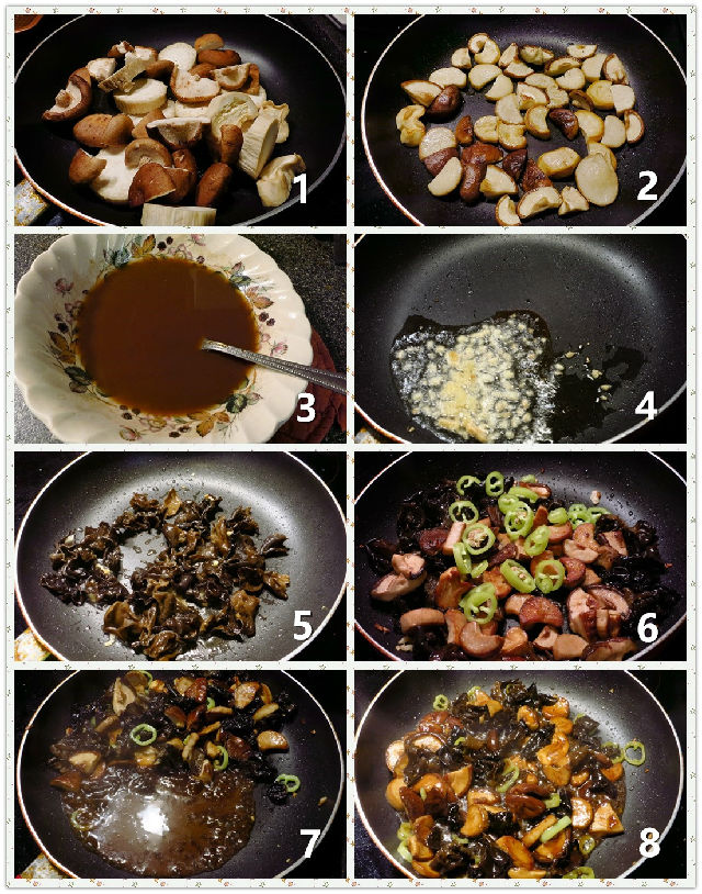 杏鮑菇5塊,冬菇8朵,干木耳1把,尖椒1只,姜米1小匙,蒜米1小匙。