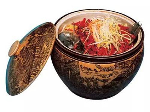 2、鍋置旺火上,下100克色拉油燒至五成熱,放大蒜片、生姜片、花椒各10克,煸香,放豆瓣醬、火鍋底料、料酒、生抽、白糖、胡椒粉、鹽、二湯大火燒開后放入鯽魚,大火燒7分鐘至熟,放味精調味,倒入用黃瓜、西瓜、哈密瓜墊底的壇中。