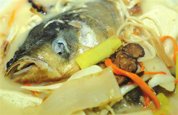2、將天麻片(絲)、核桃仁放入魚頭和魚腹內(nèi),魚置盆內(nèi),放入蔥、姜,加入適量清水后,上籠蒸30分鐘左右。