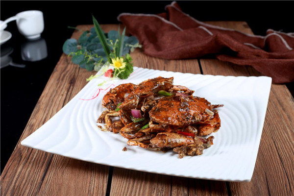 4、在鍋中放入洋蔥粒、青紅辣椒粒爆香,加入濃湯、胡椒醬調(diào)開,再下入螃蟹,用慢火炒至收汁即可。