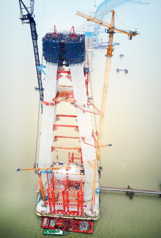 當(dāng)日,滬通長(zhǎng)江大橋28號(hào)主墩中塔柱成功合龍。中塔柱合龍之后,即將開(kāi)啟上塔柱施工模式。