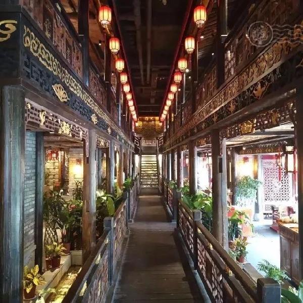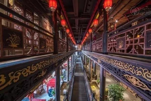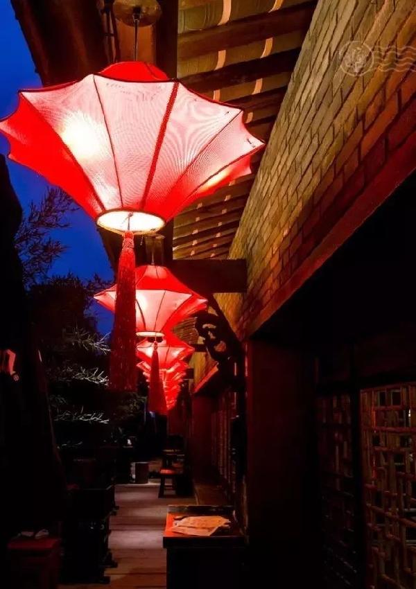十米廊腰縵回的木橋長廊,兩側(cè)檐牙高啄的亭臺樓榭,在明亮紅燈籠的點綴下有一種靜謐淡雅的大氣之美。