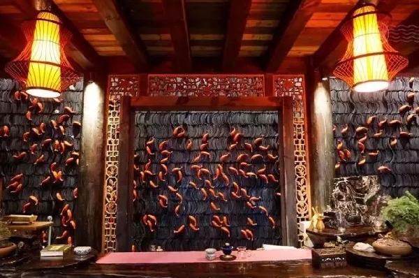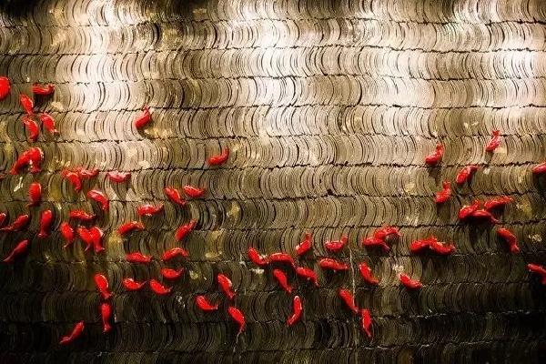 巨龍雕塑的右邊是布滿紅色鯉魚的墻壁,靈動的鯉魚將暗沉的空間調(diào)和的亮眼又舒適。